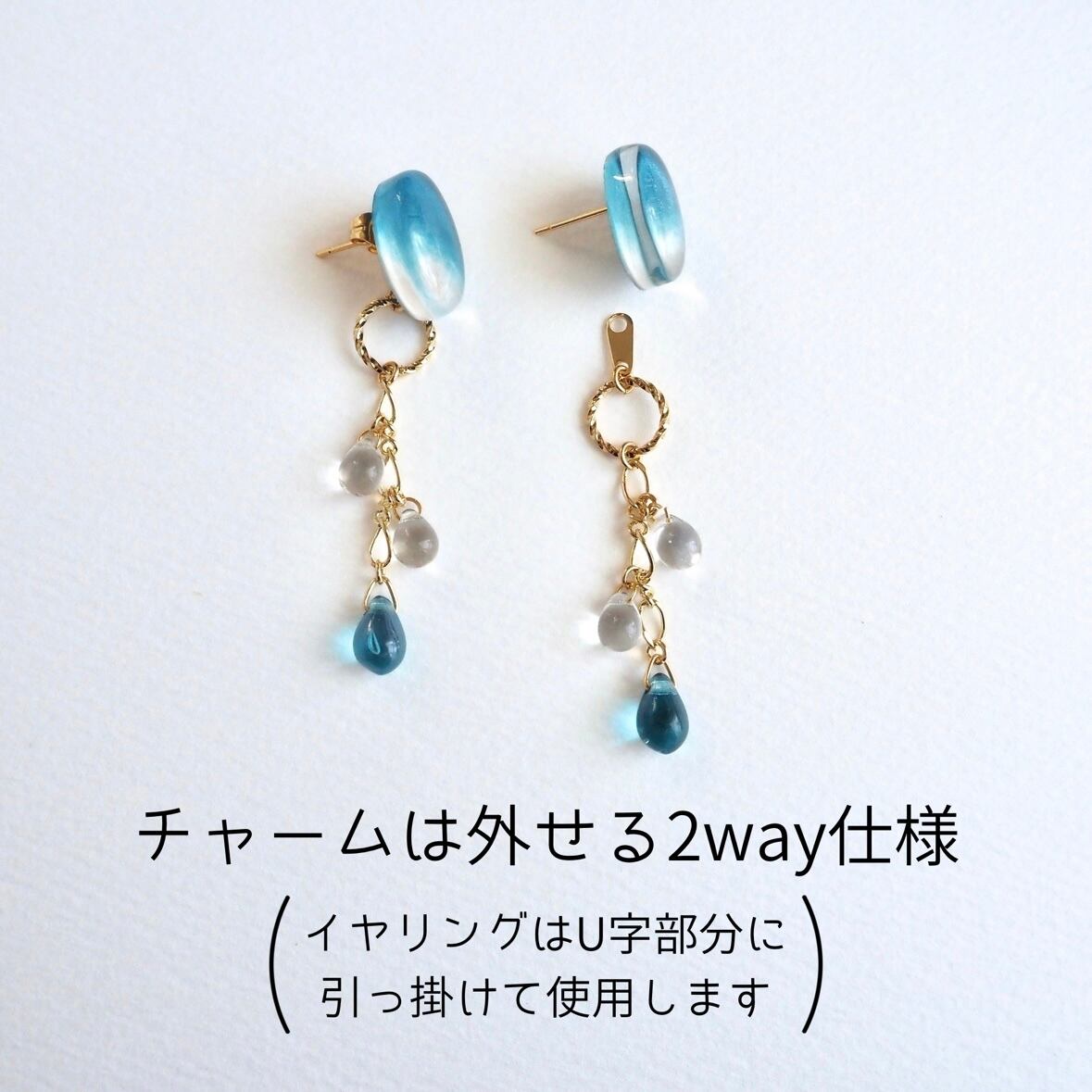 水しぶきをイメージしたドロップ形と、巻貝のチェコビーズが動くたびにゆらゆらと揺れます。