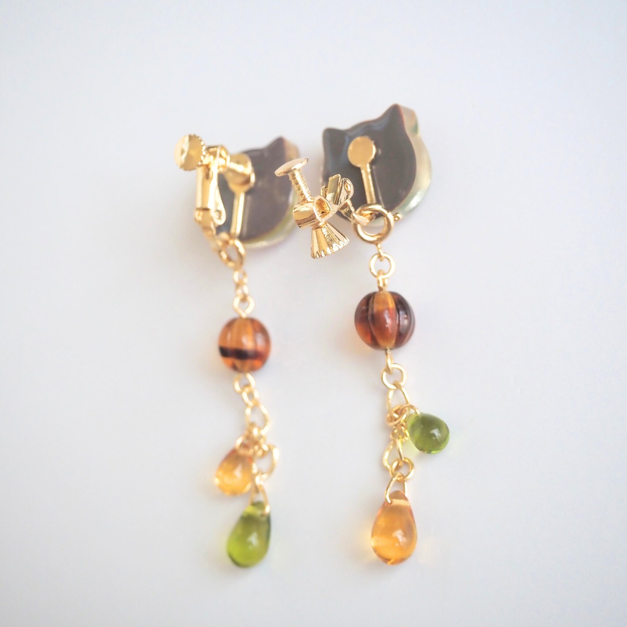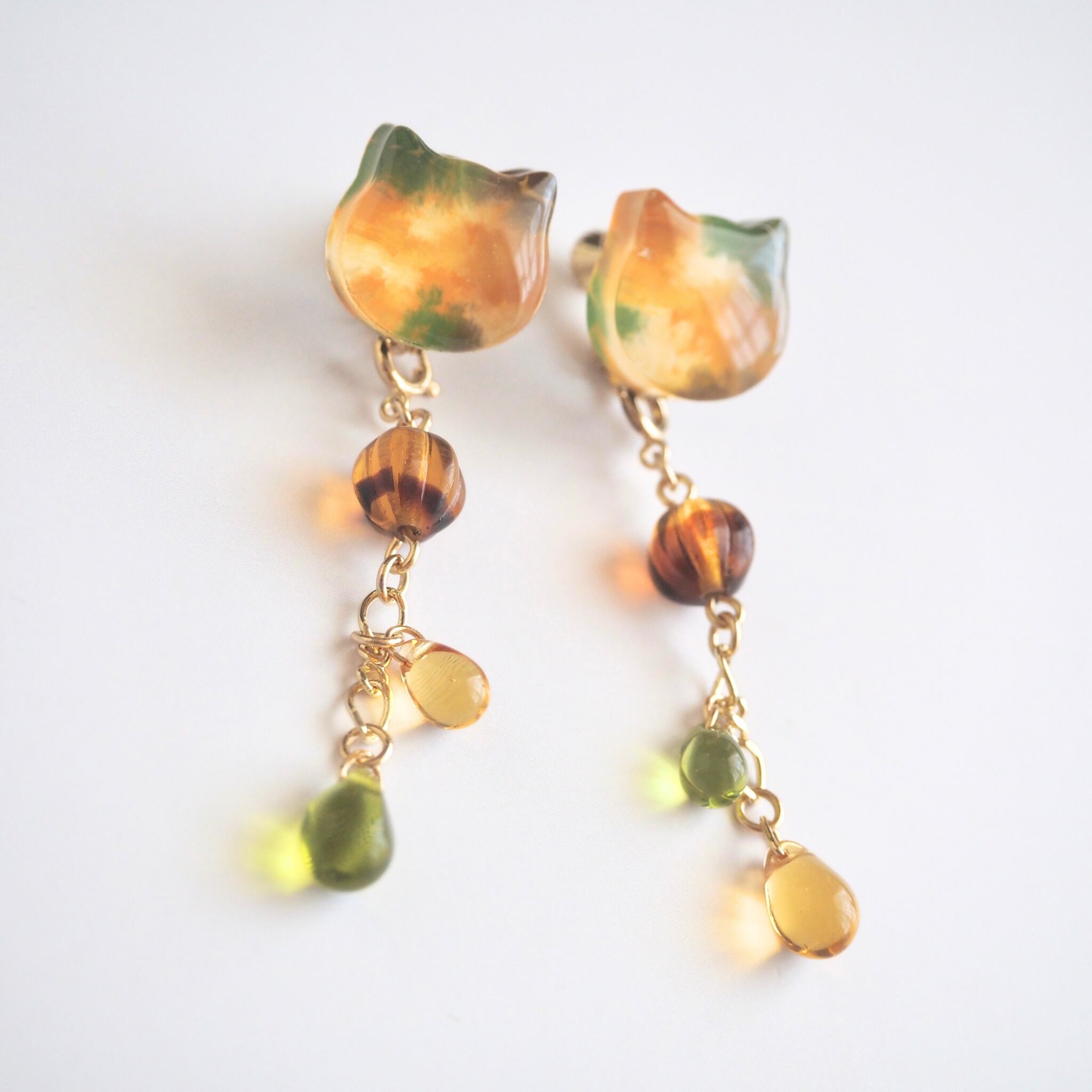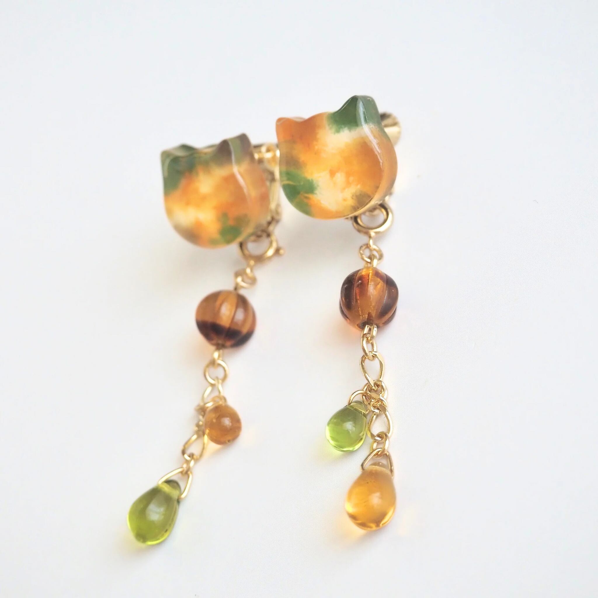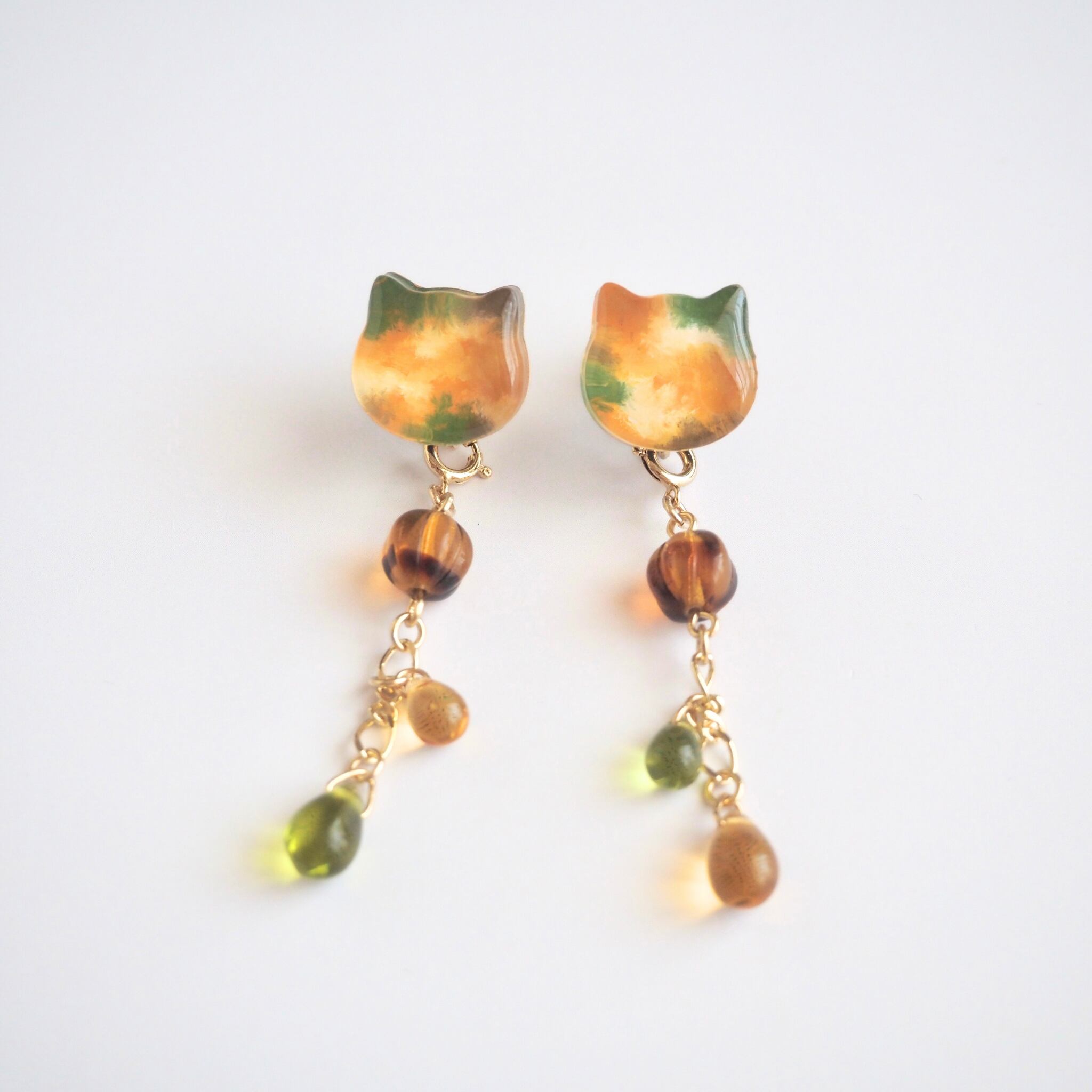 猫型のカボションにかぼちゃをイメージして色付けをしたイヤリングです