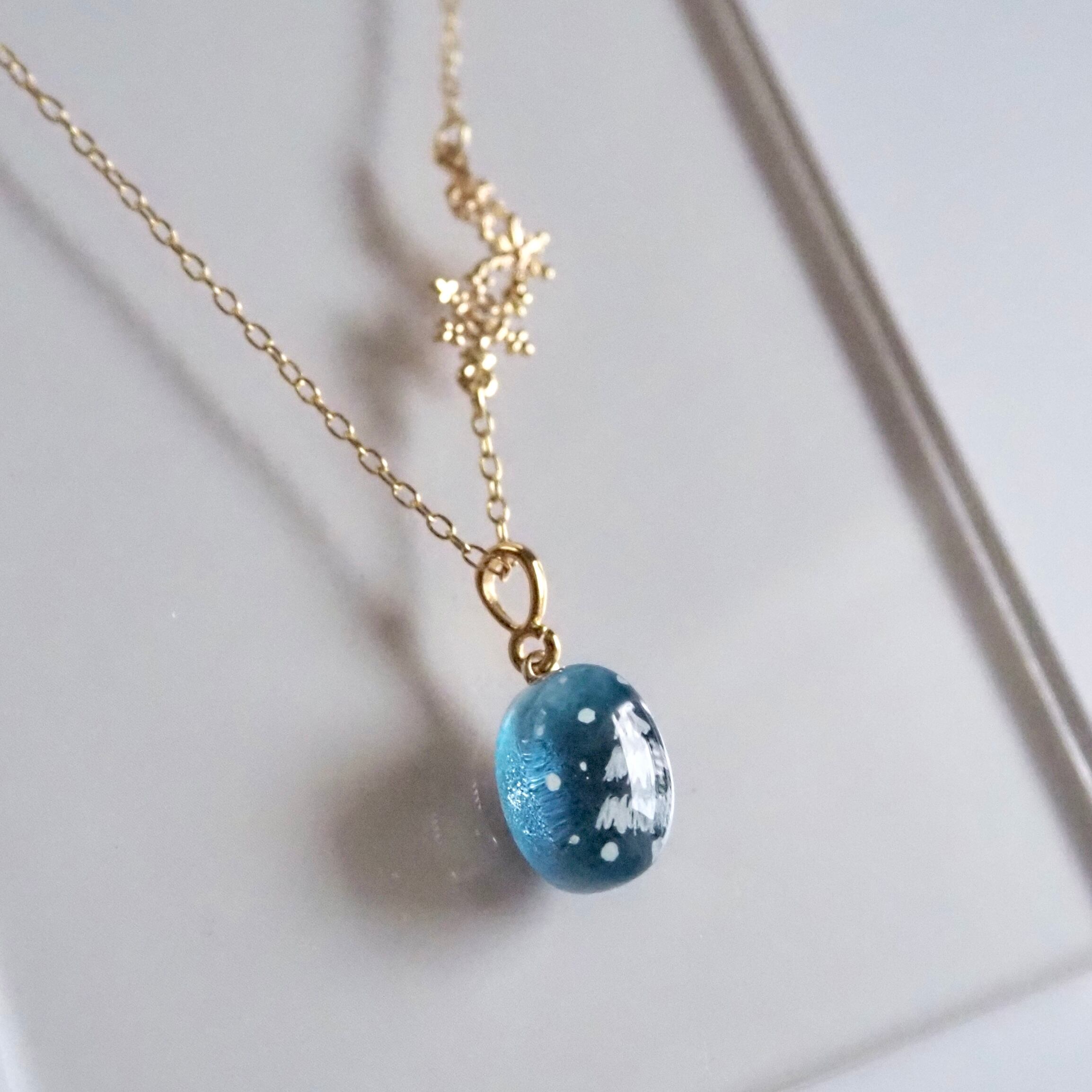 耳飾りとお揃いの手描きカボションと雪の結晶パーツが付いたネックレス。