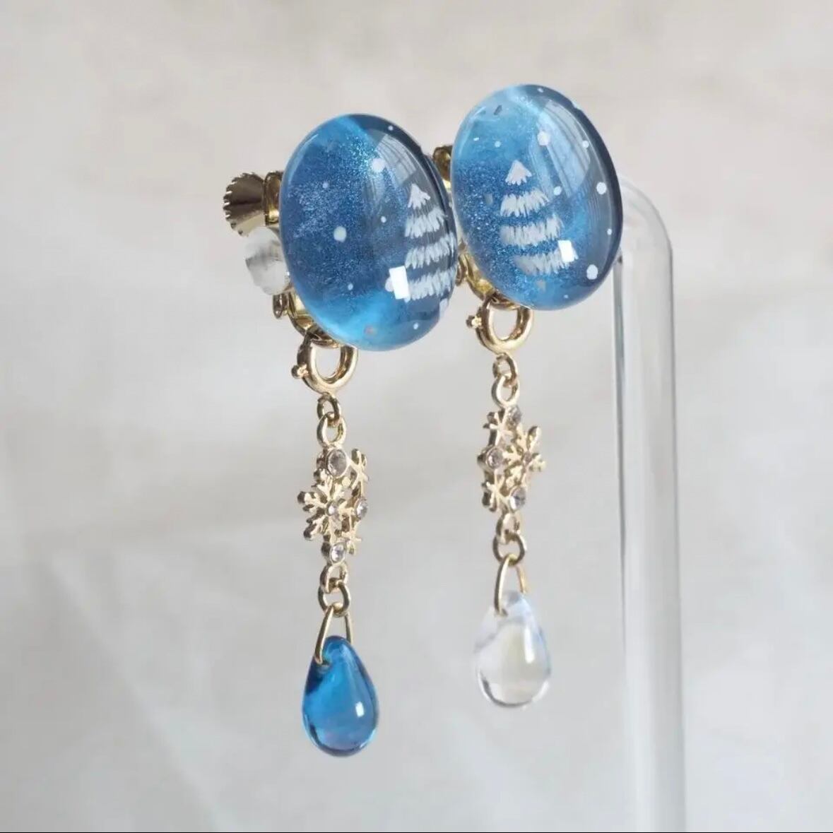 雪の結晶と雪や夜空をイメージしたチェコビーズをあしらったチャームがゆらゆら揺れる可憐なイヤリングです。