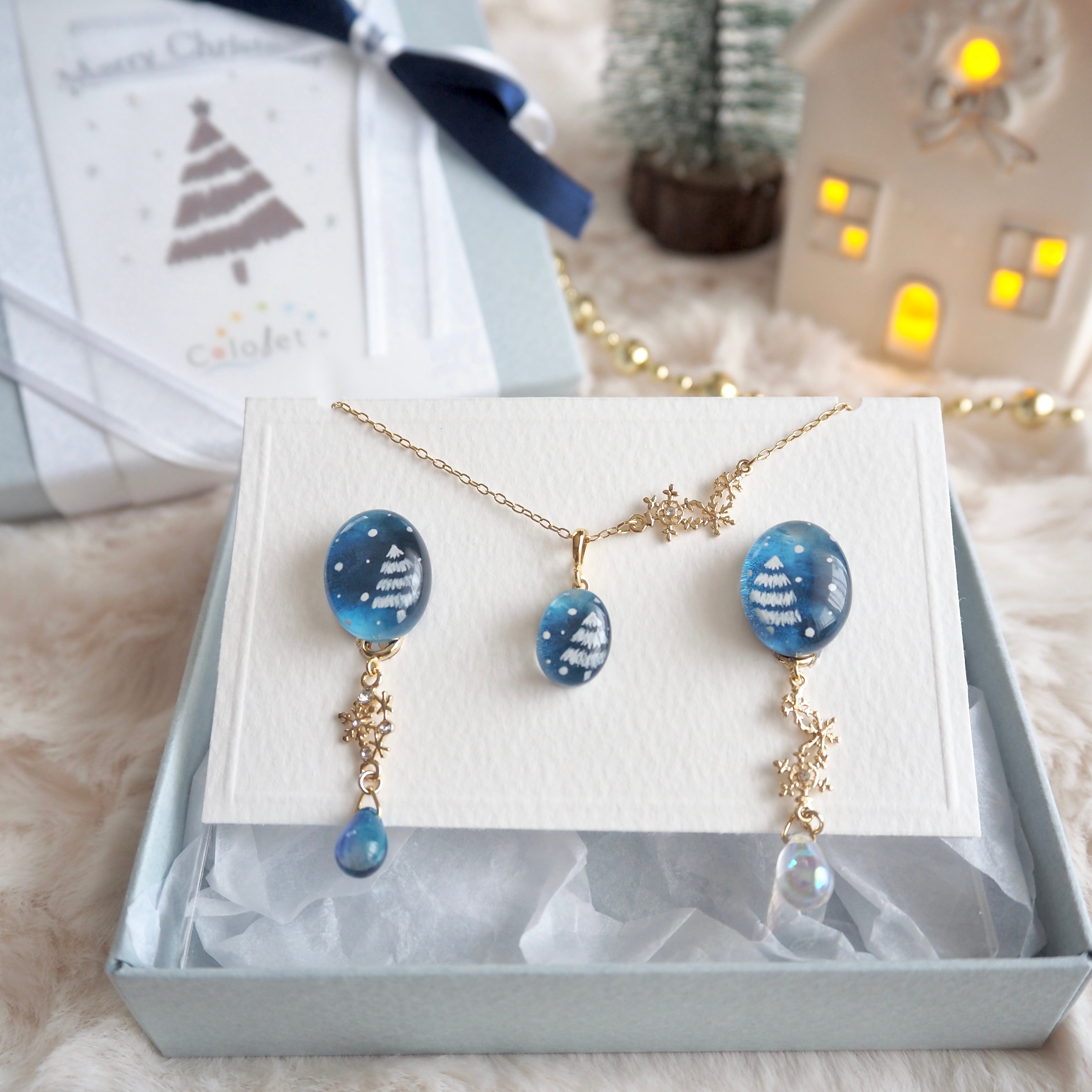 雪降る夜をイメージして描いた耳飾りとネックレスがセットになったホリデーボックス