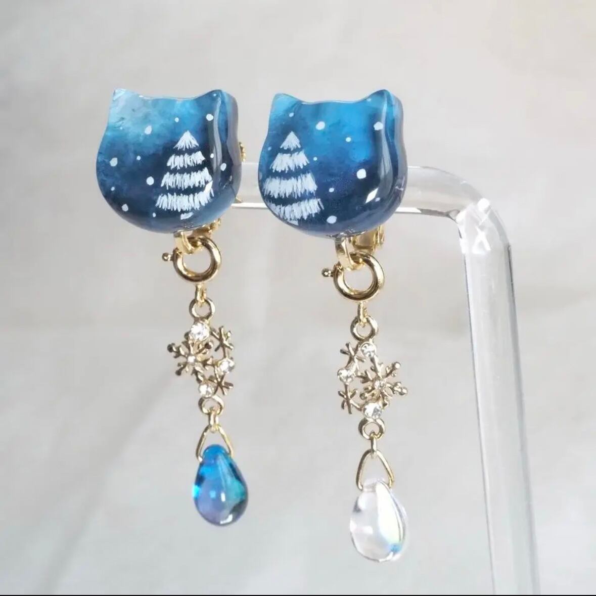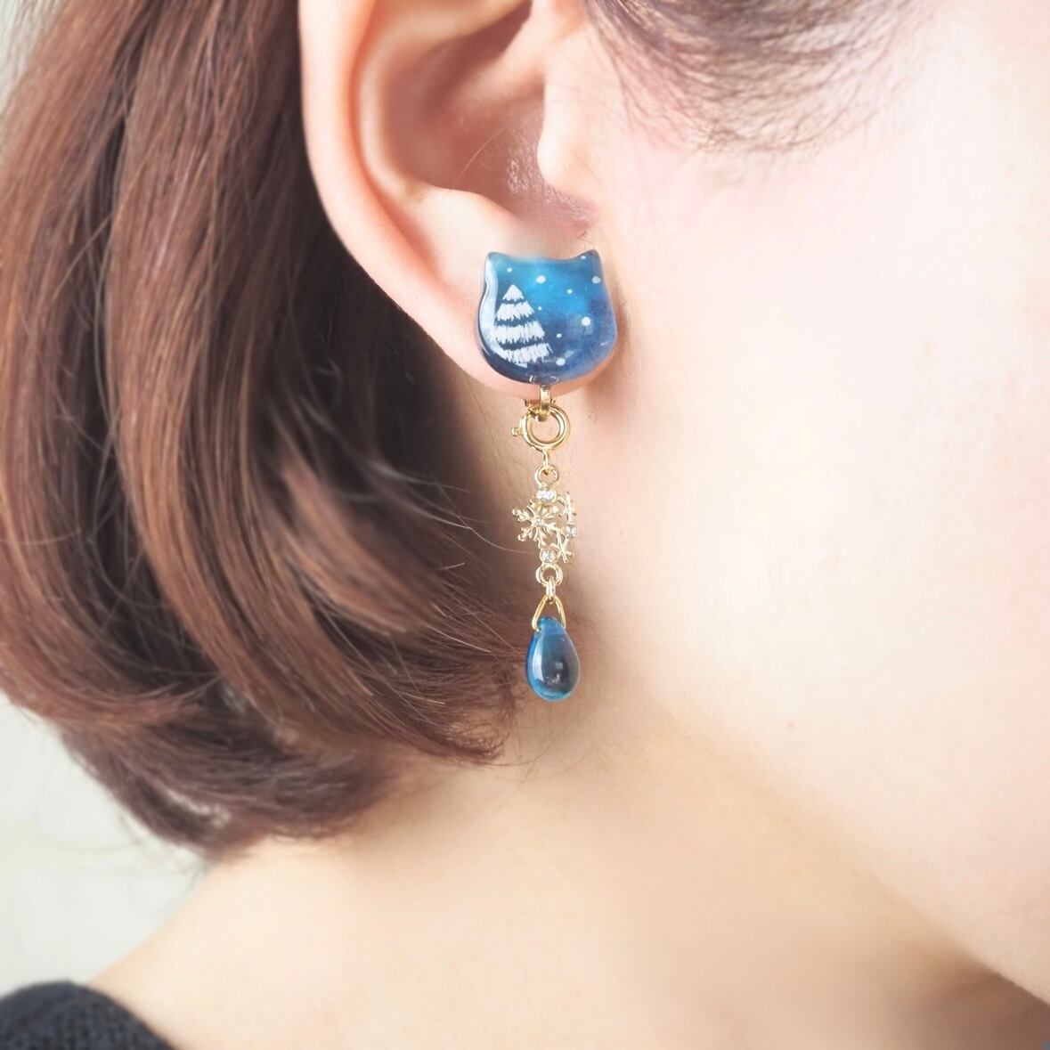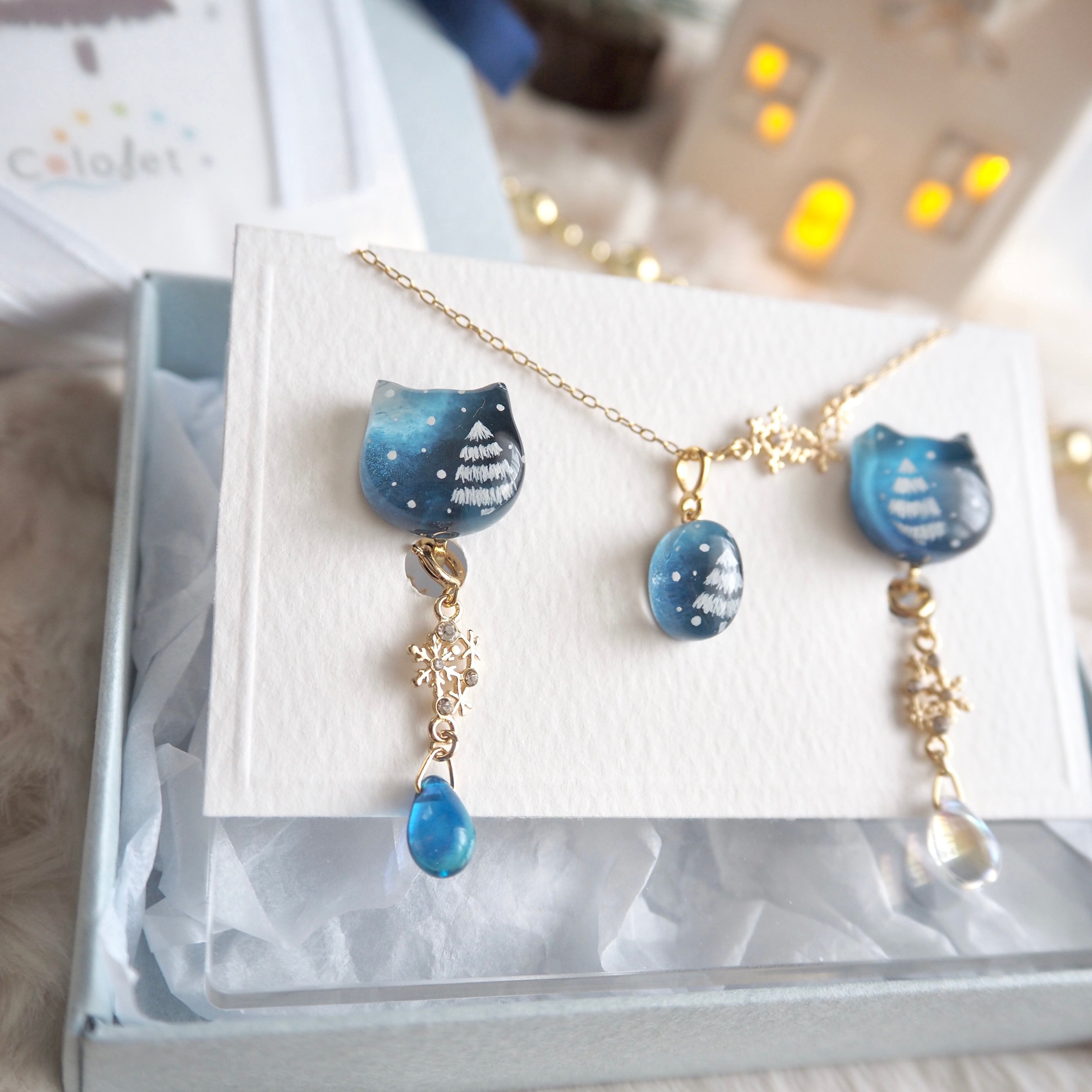 雪降る夜をイメージして描いた猫型の耳飾りとネックレスがセットになったホリデーボックス