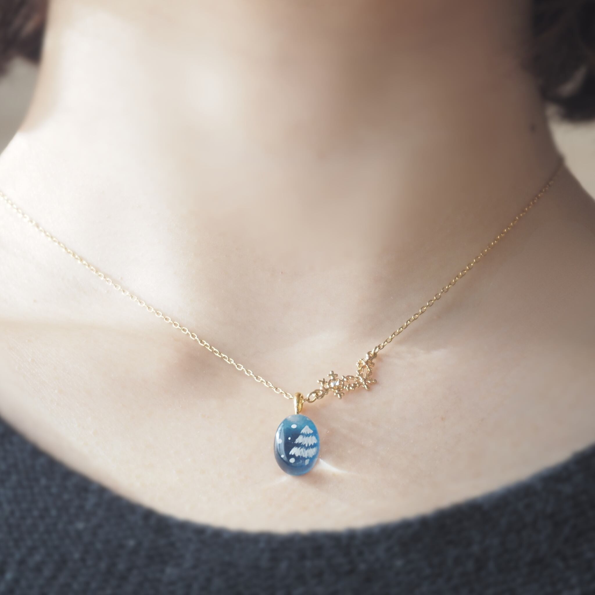耳飾りとお揃いの柄の手描きカボションと雪の結晶パーツが付いたネックレス。