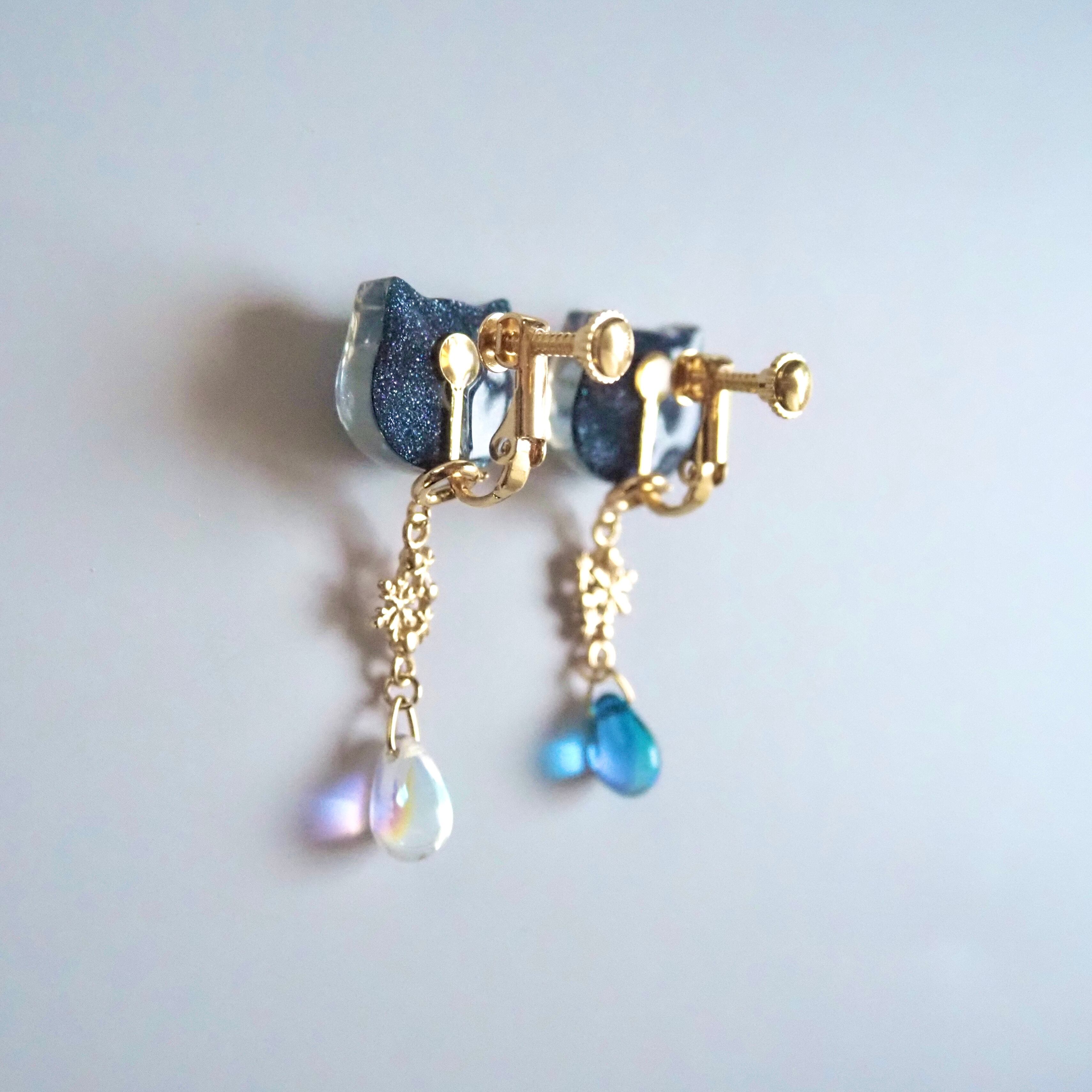 雪の結晶と雪や夜空をイメージしたチェコビーズをあしらったチャームがゆらゆら揺れる可憐なイヤリングです。