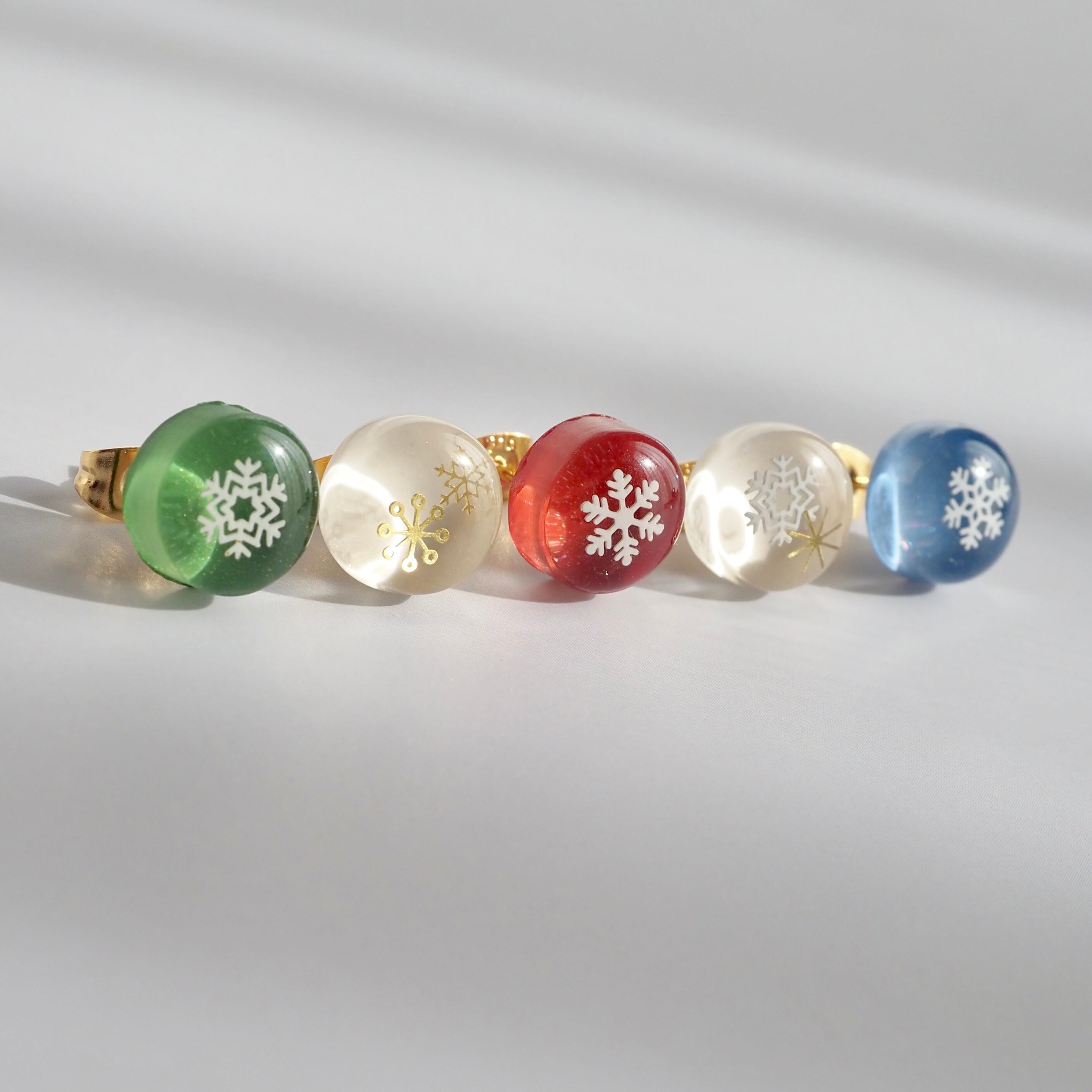 雪の結晶のカボションにはラメカラーを使用しており、光の角度によってキラキラと繊細に輝きます。