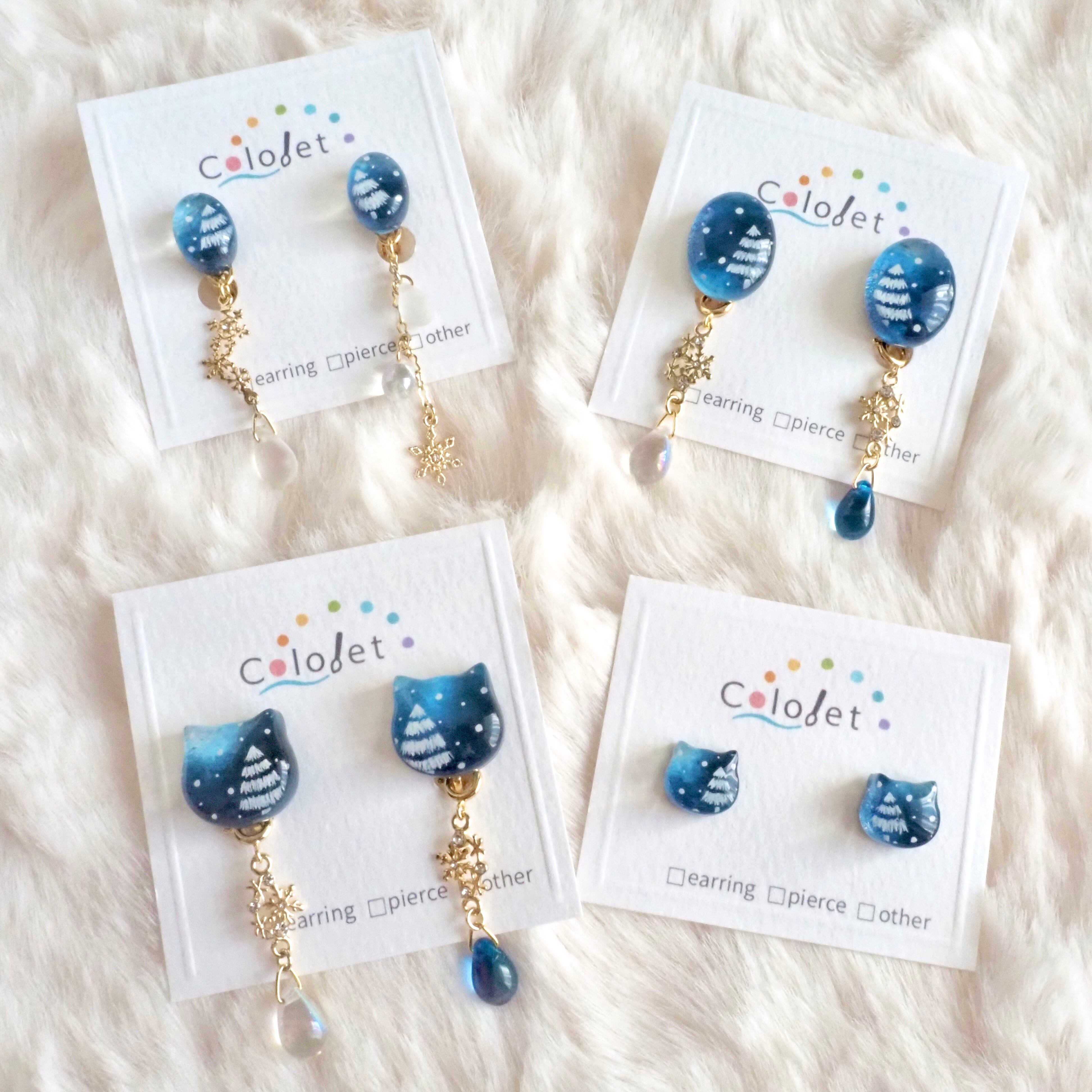 雪降る夜をイメージして描いた小さな猫型の耳飾り