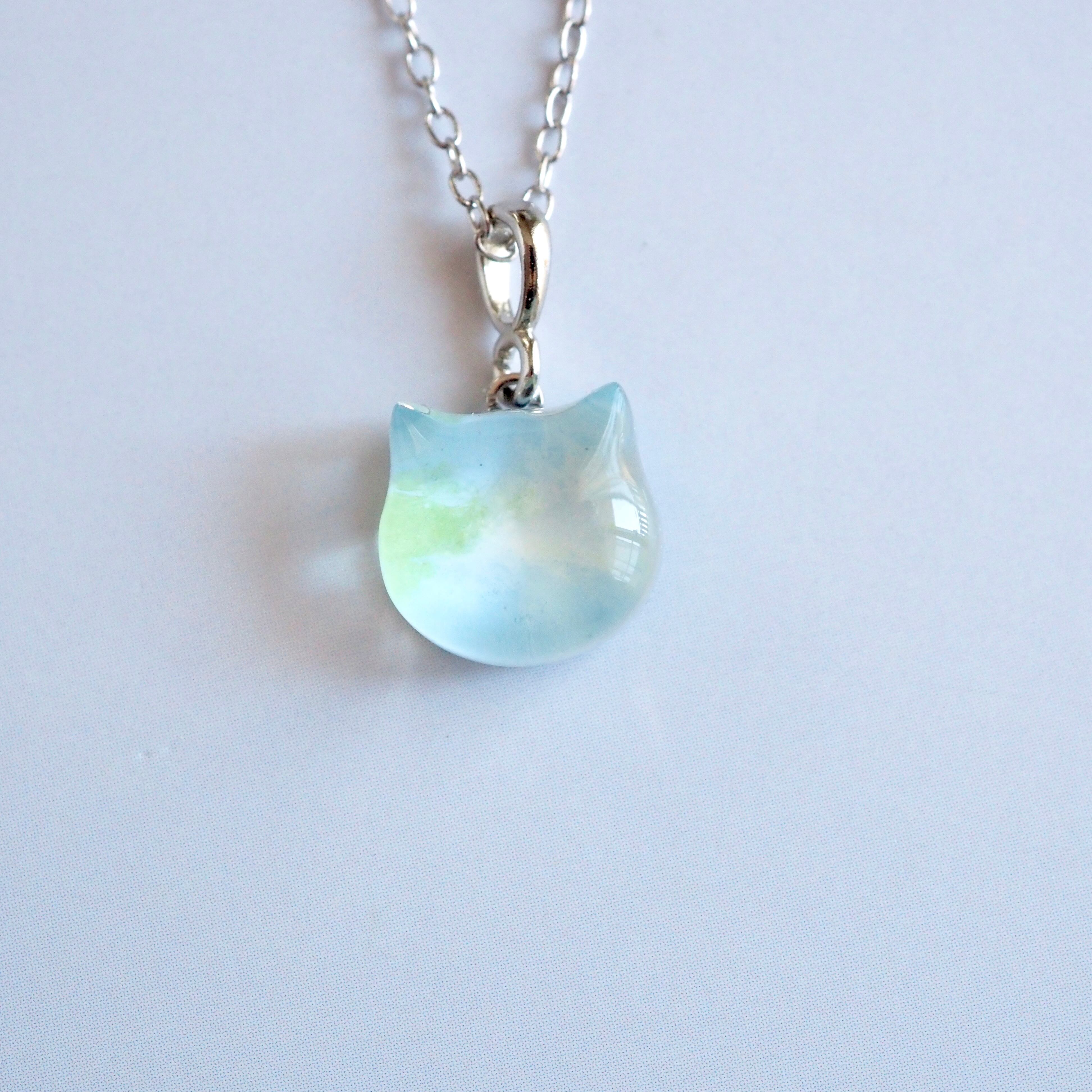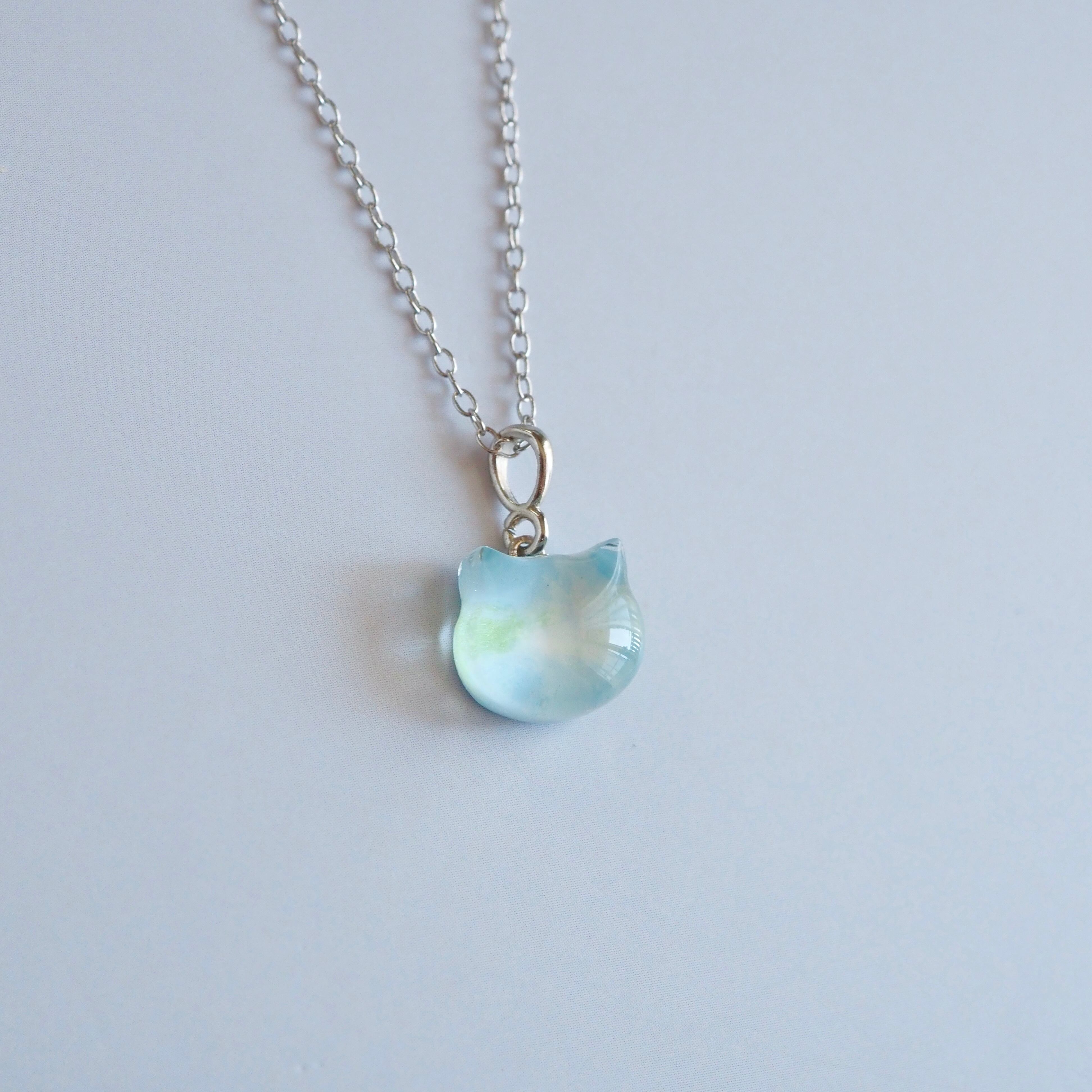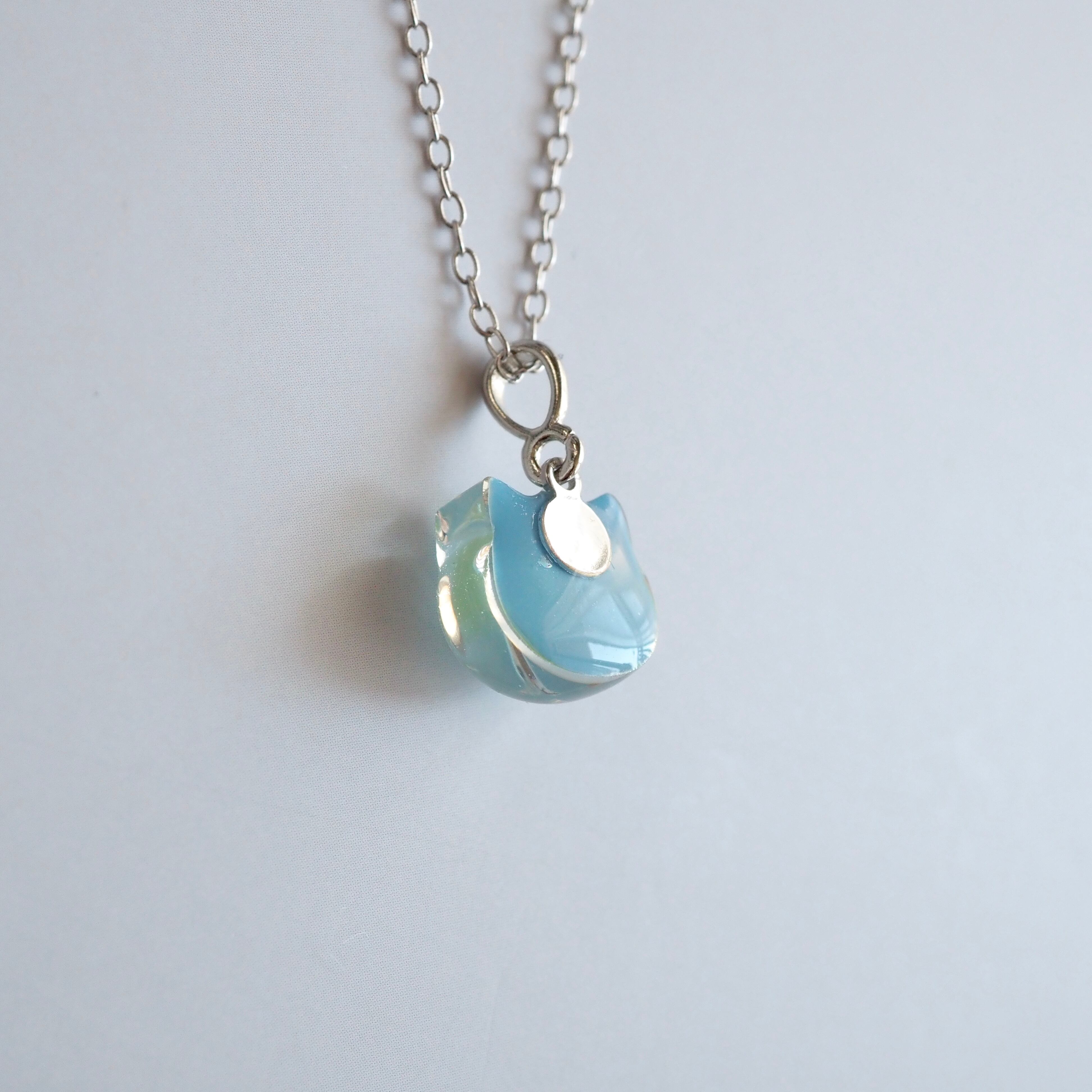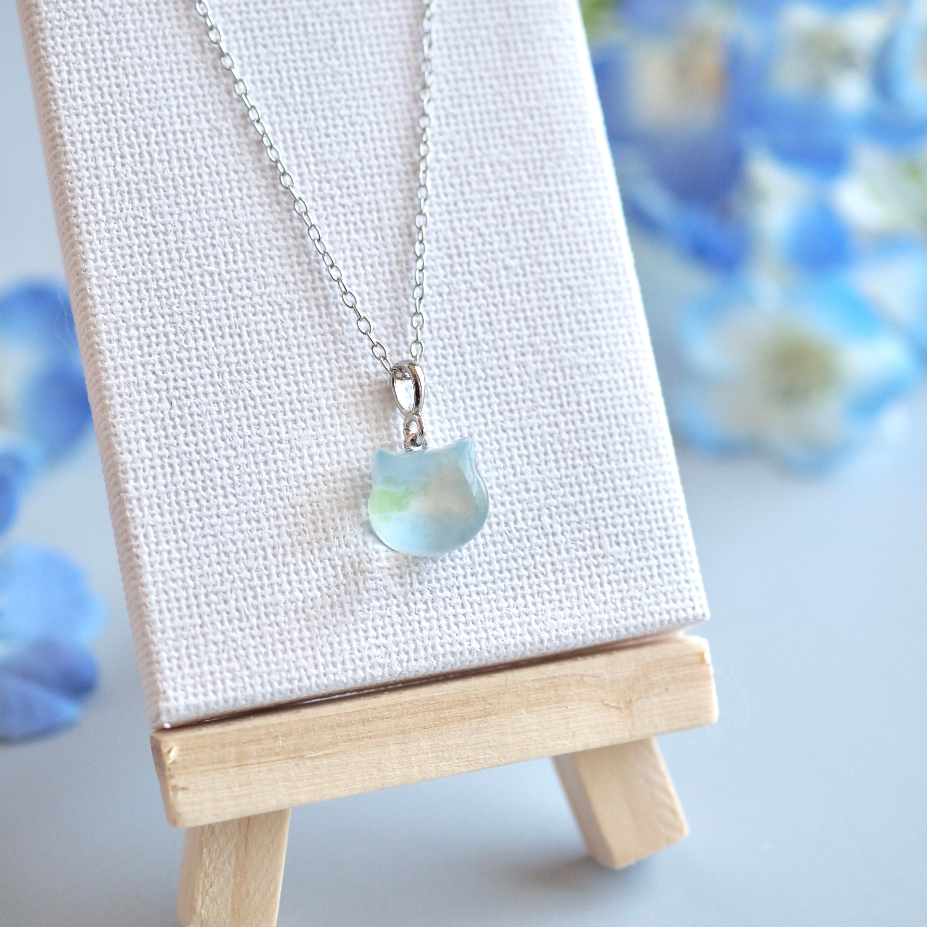 ネモフィラをイメージして色を重ねた、小さな子猫のネックレス