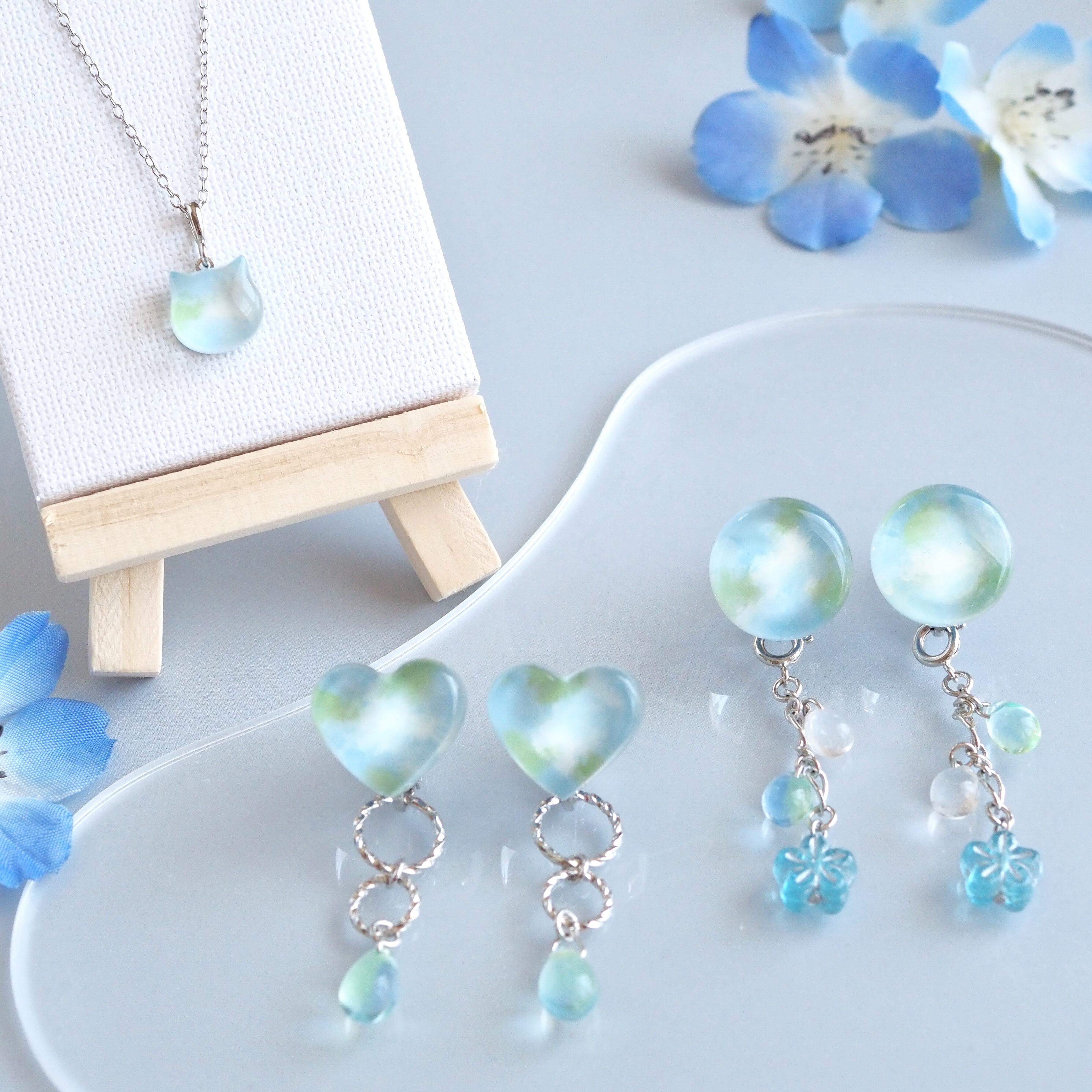 青空の下に咲くネモフィラをイメージして色を重ねた円形の耳飾り
