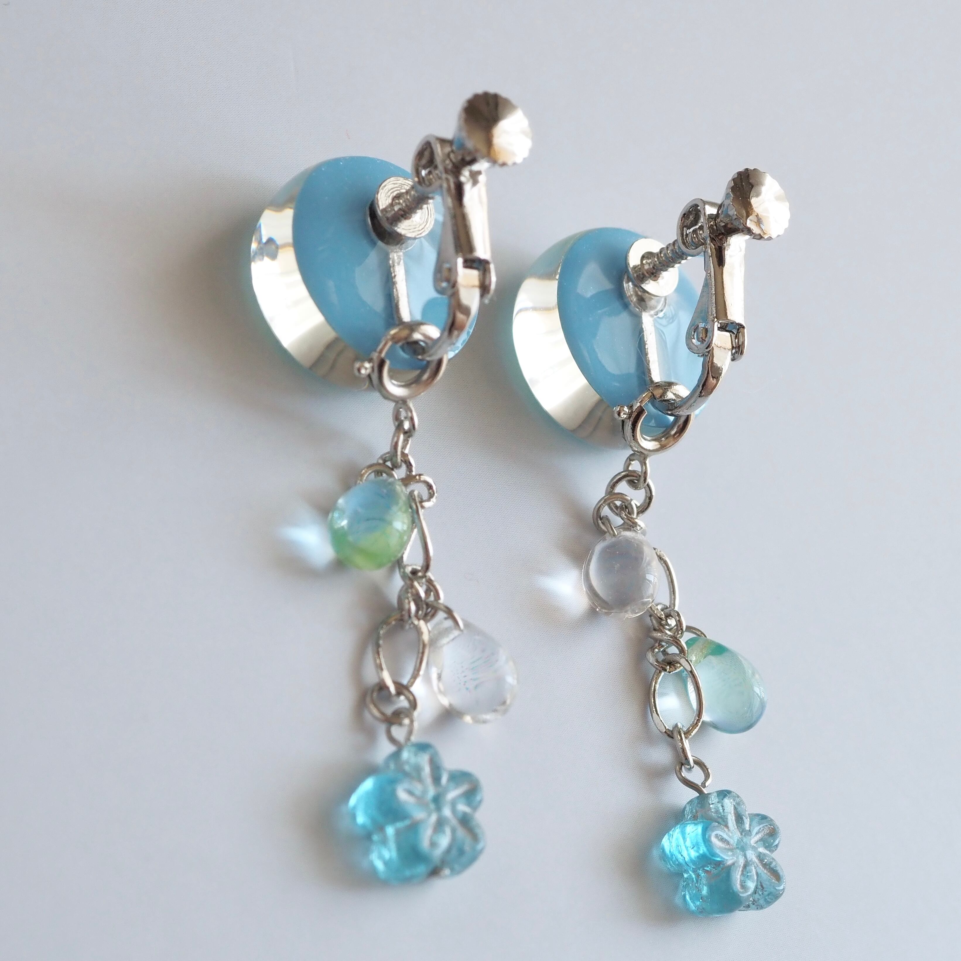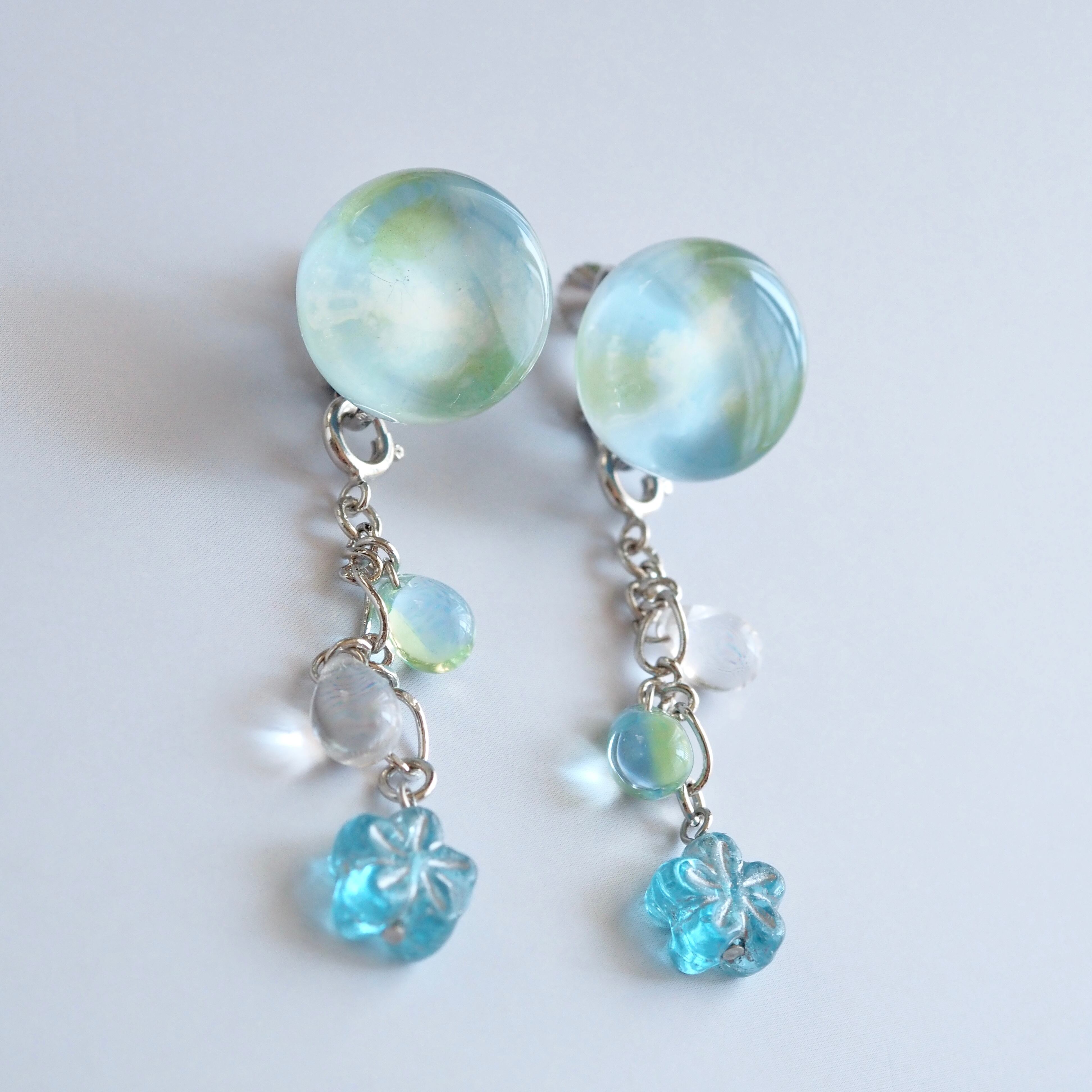 しゃらりと揺れるチャームにはネモフィラのような小さなお花とクリア&青×黄緑の珍しいチェコビーズを使用