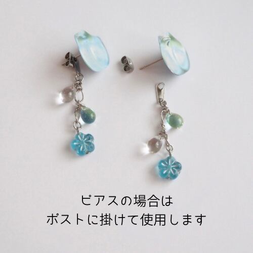 しゃらりと揺れるチャームにはネモフィラのような小さなお花とクリア&青×黄緑の珍しいチェコビーズを使用