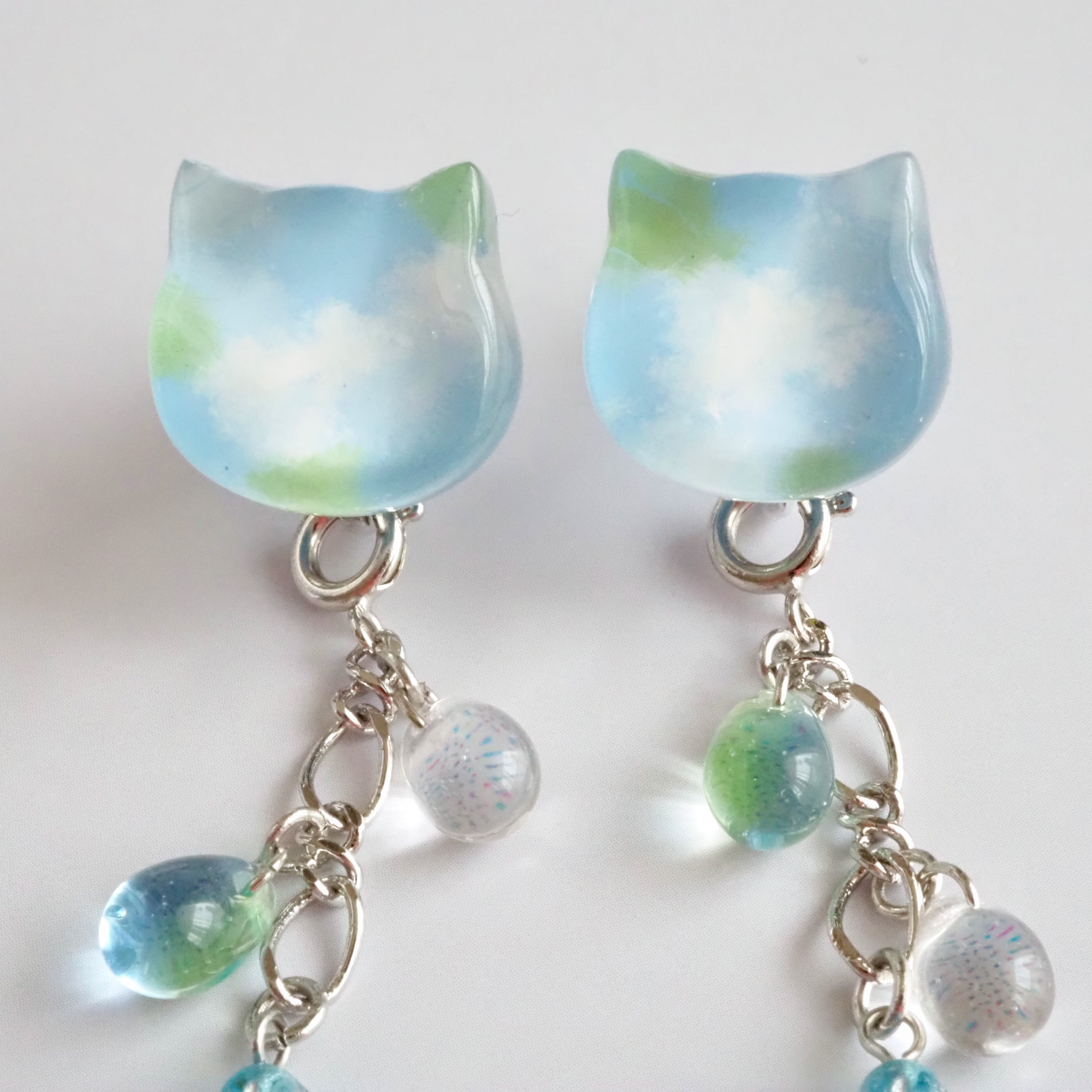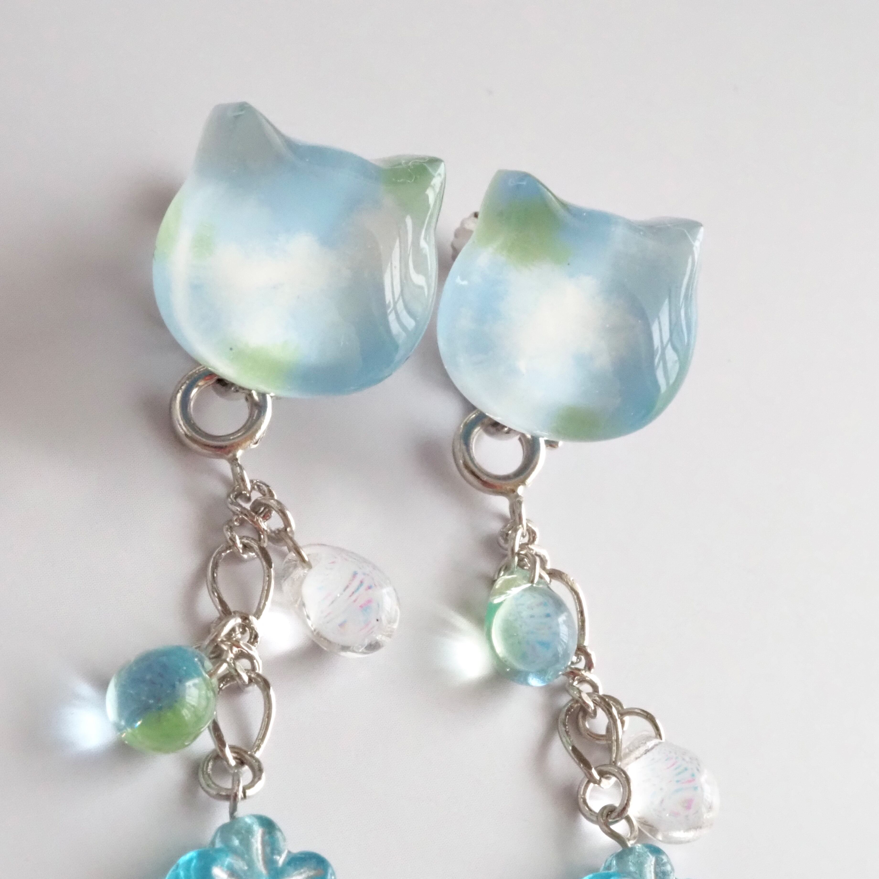 青空の下に咲くネモフィラをイメージして色を重ねた猫ちゃんの耳飾り